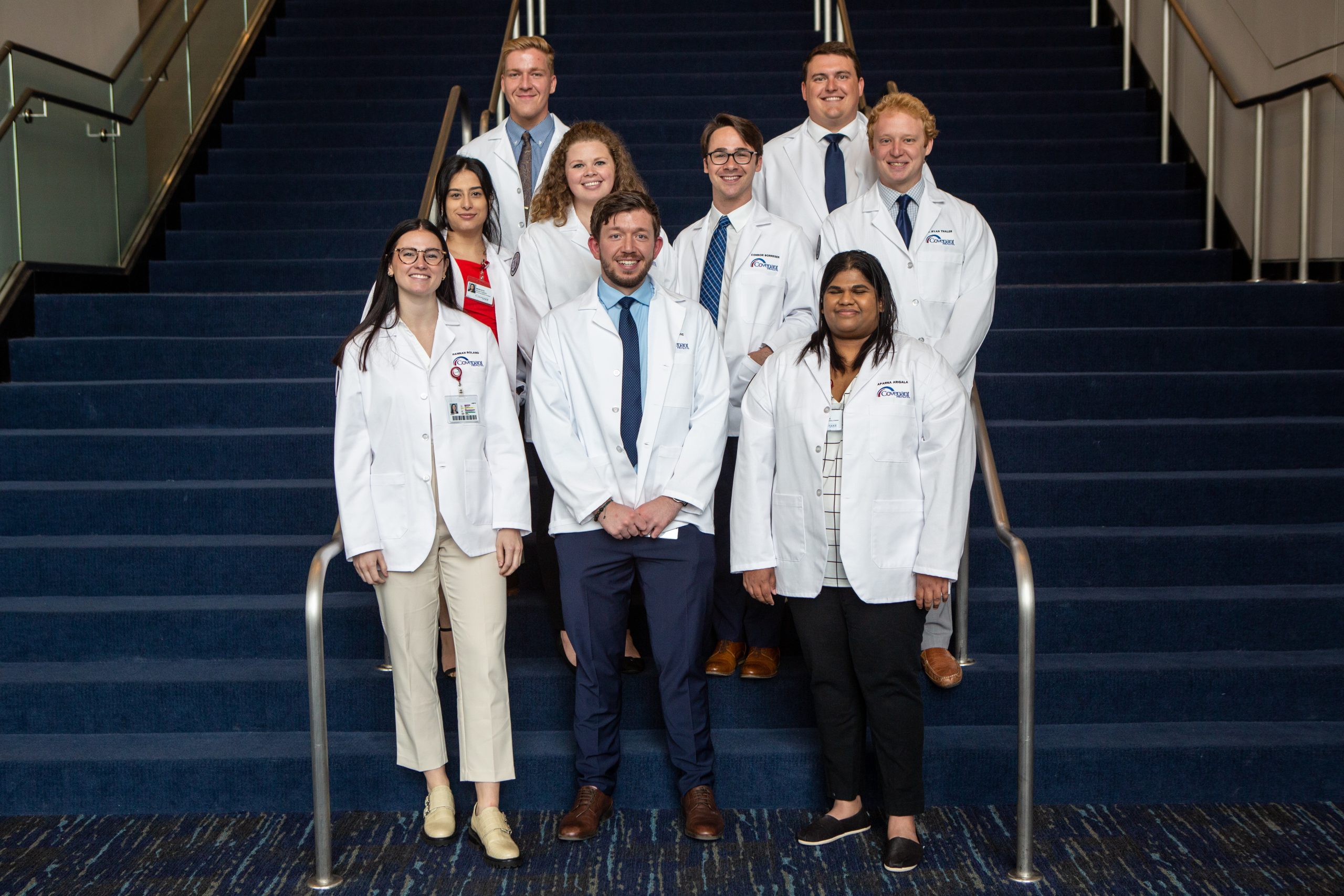 The white coats represent a bridge between medical school and the new experience of rigorous work in a clinical atmosphere. The students’ coats are embroidered with their names and a Covenant Health logo.