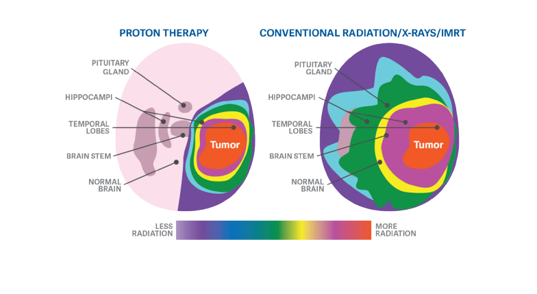 Proton therapy enables physicians to precisely determine the shape, size, depth and dose of treatment to effectively treat tumors while avoiding and eliminating damage to nearby healthy organs and tissues. Reducing or eliminating unnecessary radiation to healthy tissue improves quality of life during and after treatment by reducing the side effects.