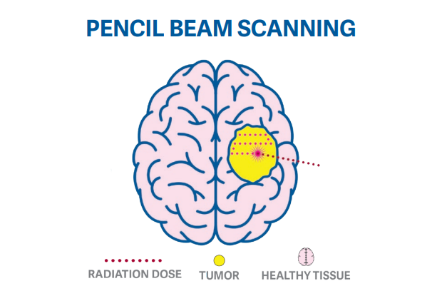 - Pencil Beam: Feature of the proton therapy treatment unit from which the protons are administered. Allows for targeted, precise doses of radiation, minimizing negative side effects and providing a lower risk of damage to surrounding tissue.